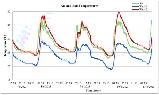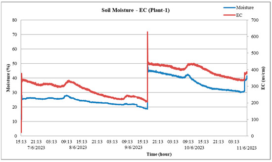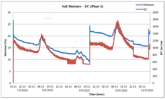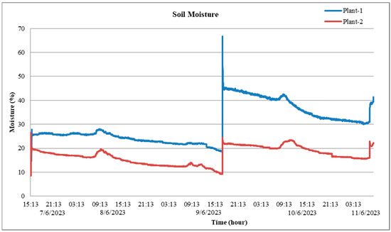 Figure 24 shows the recorded soil pH data graphs, where the blue and red lines represent the soil pH of Plant-1 and Plant-2, respectively. The figure shows that the Plant-2 soil pH is acid, which is caused by the fertilizer soil of Plant-2. The figure also shows that the data reading is noisy. The noisy data is a result of the sensor accuracy of ±0.3 pH and the effect of the soil moisture or EC error reading, as shown in the Plant-2 soil pH on 11 June 2023 (after 21:13 h).