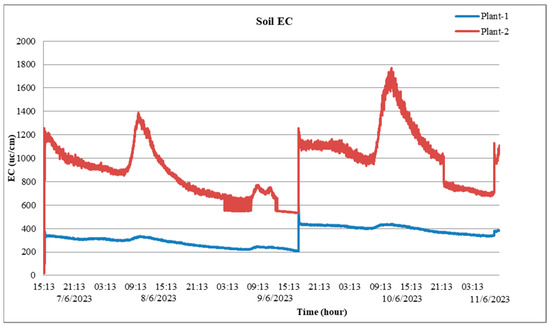 Figure 23 shows the recorded soil EC data graphs, where the blue and red lines represent the soil EC of Plant-1 and Plant-2, respectively. The figure shows that the soil EC is higher for Plant-2 than Plant-1. It is caused by the fertilizer soil for Plant-2, which conducts more electricity than the regular soil of Plant-1.