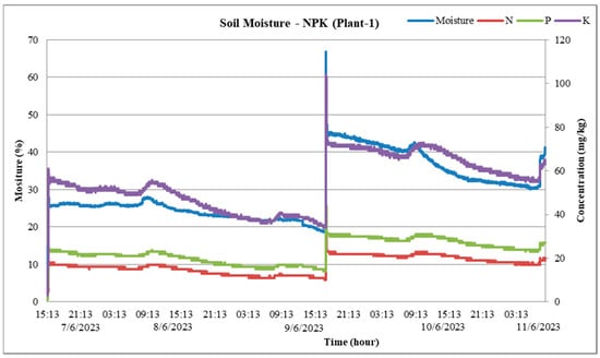 Recorded soil moisture and N, P, K data graphs of Plant-1.