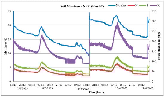 Recorded soil moisture and N, P, K data graphs of Plant-2.