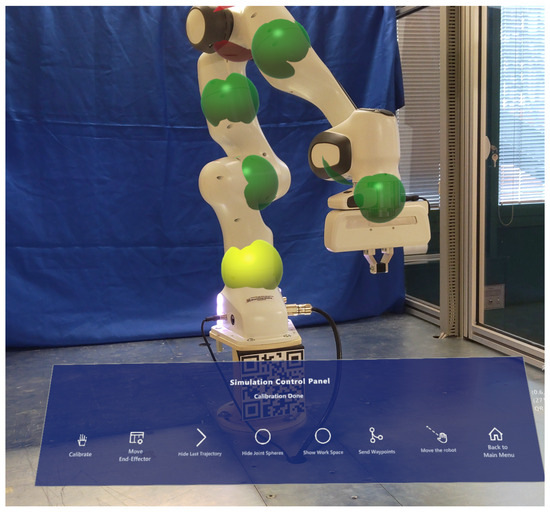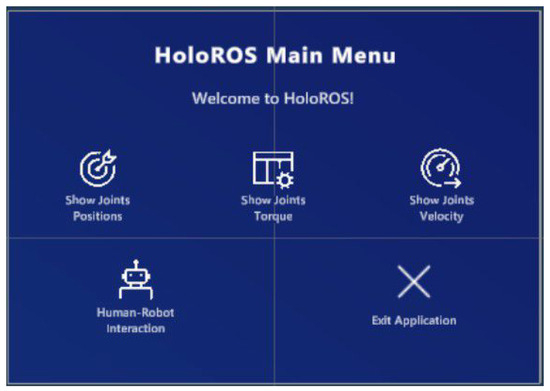 Through the “Human-Robot Interaction” button on the main menu, the user can access the AR scene and the control panel, shown in Figure 3, with eight different buttons. More in detail: