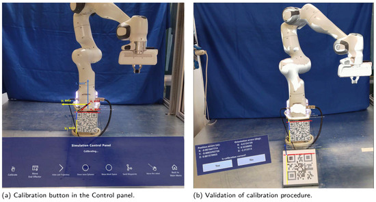 Once the hologram is collocated in the AR environment, the user has to verify the calibration accuracy. For this reason, she/he has to evaluate the position and the orientation of the robot hologram as well as the calibration errors which are displayed on a panel, as shown in Figure 4b. If the “No” option is chosen, then the procedure must be repeated and a message appears on the control panel.