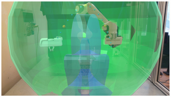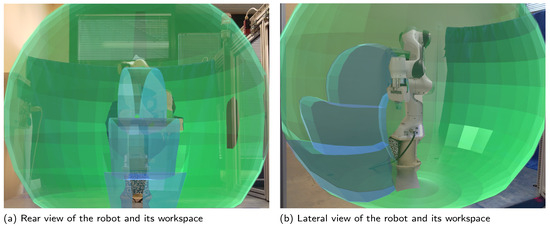 Consider the teaching-by-showing technique for robot programming: while the operator guides the cobot manually along the desired motion path, the data read by joint position transducers are stored and can be played back [31]. As this action could be performed also by an operator without technical knowledge, the teaching-by-showing technique is widespread in industrial field. During the training for the task, it should be useful to inform the operator about the status of the robot joints in terms of the distance for their physical limits ( and ). In detail, a sphere per virtual joint is displayed in AR environment and aligned to the relative robot joint. As can be seen in Figure 5, the i-th sphere (with ) is characterized by variable colors to inform the operator about the joint status: