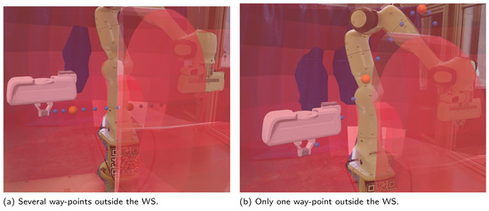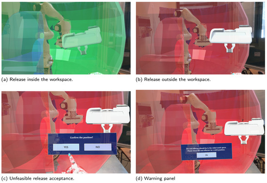 Regardless of whether the robot workspace is visible, a check over trajectory feasibility is always executed. Indeed, if the operator releases the end-effector hologram outside the reachable space (Figure 7b), the entire workspace is displayed in red in order to warn her/him about the uncorrected position. If the user accepts an unfeasible position of the end-effector, even in the presence of the red workspace (Figure 7c), a panel appears advising her/him to modify the goal point (Figure 7d).