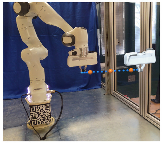 Denote with and the coordinate frames attached to the top left corner of the two QR codes, respectively. Based on the previous assumption, the relative positions ( and ) and orientations (expressed in terms of rotation matrices [31] as and ) between the QR codes’ frames and the robot base frame are constant and known in the real world. The superscript r indicates that all the quantities are expressed with respect to the robot base frame.