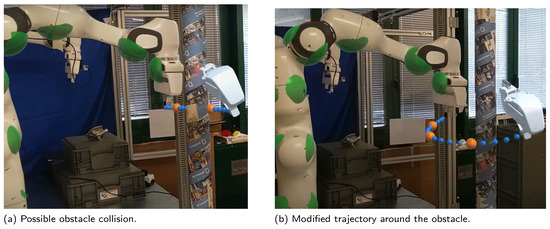 Furthermore, AR can be adopted to test program safety by a digital twin: real-time interaction between the real and a virtual world allows for programming by demonstration, i.e., a widespread way to program an industrial robot, which is required to save the poses the robot has assumed in a virtual environment, without unsafe actions occurring. In the system developed by Ostanin et al. [24], basic and advanced functionalities of HRC are implemented: