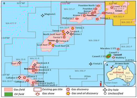 - Le Poidevin, S.R.; Temple, P.; Edwards, D.S.; Kuske, T. Australian Petroleum Accumulations Report 7 Browse Basin: Western Australia and Territory of Ashmore and Cartier Islands Adjacent Area; Geoscience Australia: Canberra, Australia, 2015.