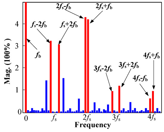 Set fs to 10 kHz and fb to 500 Hz; the three-phase current harmonics are plotted in Figure 1. The Harmonics with high content are marked in red, and the other harmonics are represented by blue bars. As shown in the figure, the main current harmonics appear in the vicinity of the switching frequency, which is consistent with (7).