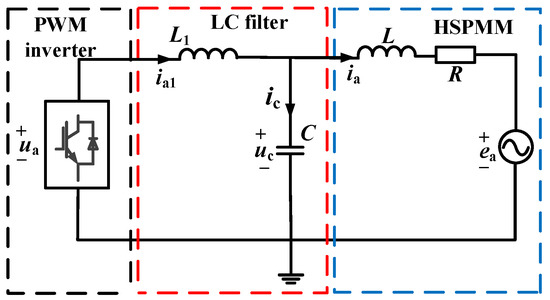 In order to restrain the high-frequency harmonics, the three-phase output LC filter is connected between the inverter and the HPMSM. The single-phase circuit topology of the HPMSM drive system is illustrated in Figure 2.