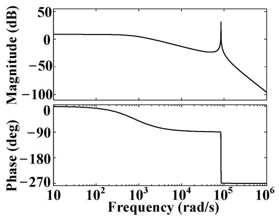 Figure 3 shows the Bode diagram of HPMSM with the LC filter. As shown in the diagram, although the introduction of the LC filter enhances the system’s ability to suppress high-frequency harmonics, it leads to the appearance of the resonance in the control system at high frequency and also produces phase changes by −180 degrees. This phase change brings a pair of closed-loop poles in the right half of the s-plane, leading to instability of the system. To solve this problem, the resonant frequency needs to be determined.
