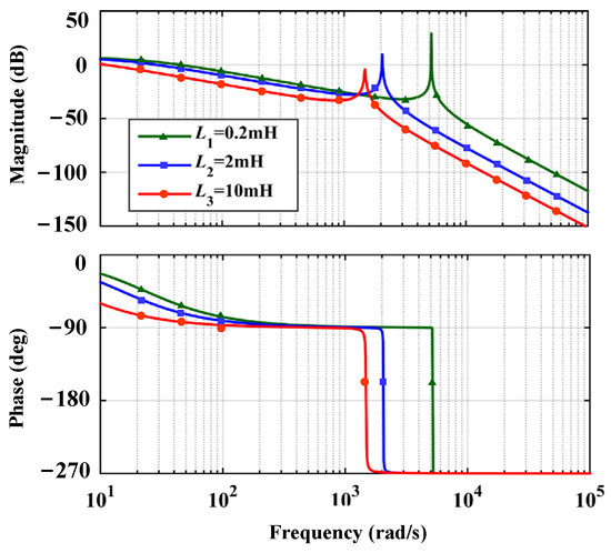 The system’s Bode diagram is depicted in Figure 4 when the inductance of the LC filter varies. The cut-off frequency and resonance peak of the system decrease with the increase of the inductance, so it seems that the system resonance can be suppressed by simply increasing the inductance. In reality, however, increasing the filter inductance will enlarge the volume and weight of the LC filter, which is not conducive to the design of the drive system. Therefore, the resonance peak can be suppressed using alternative techniques. The most commonly used methods include passive and active damping methods.