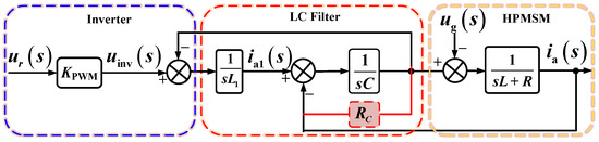 In passive damping, a resistor is connected in parallel to the capacitor ends of the filter. The control diagram of the network is shown in Figure 5, where RC is the parallel resistance. The transfer function from the output voltage of the inverter to the current of HPMSM can be calculated as