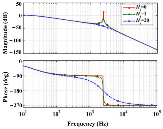 Then, the Bode diagram can be drawn as shown in Figure 8. It is clear that by adjusting Hi, the active damping method can have a similar effect as the passive damping method without introducing additional energy losses. Nevertheless, as shown in Figure 7, to achieve the capacitor current proportional feedback method, the capacitor current is needed. Since the LC filter is connected between the inverter and the motor, the current hall sensor is often used to obtain the current value of the capacitor. Figure 7 shows the control diagram of a single phase. In fact, all three phases of capacitive current need to be sampled, so at least two additional current sensors are required. This increases the costs and reduces the reliability of the system, which limits the application of the traditional active damping method in practice.