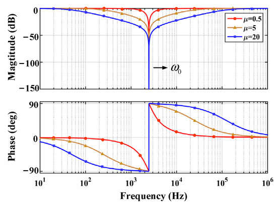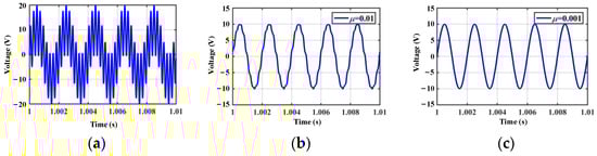 where . Based on (28), set different step sizes and draw the Bode diagram, as shown in Figure 10. Let , where Q represents the quality factor, and then the ANF can be equivalent to a band-stop filter with a center frequency of . The step size μ is an important factor in the filtering capability. As shown in Figure 11, the original signal has a fundamental frequency of 500 Hz with a 4500 Hz harmonic superimposed. When μ = 0.01, the filtered waveform still has significant harmonics, but when μ = 0.001, harmonics are filtered out completely. However, the former takes only 0.05 s to converge, while the latter takes 0.2 s. Therefore, it is necessary to consider the filtering effect as well as the convergence time and choose a suitable step size. Generally, μ is not less than 0.01.