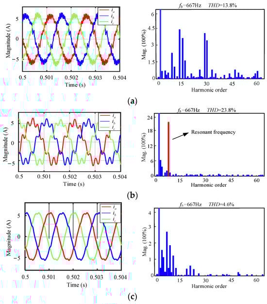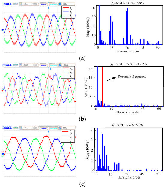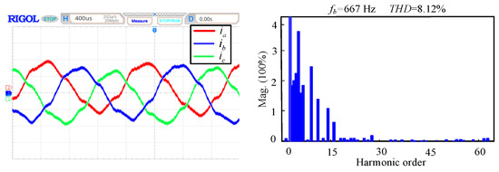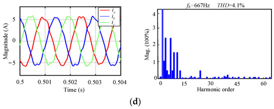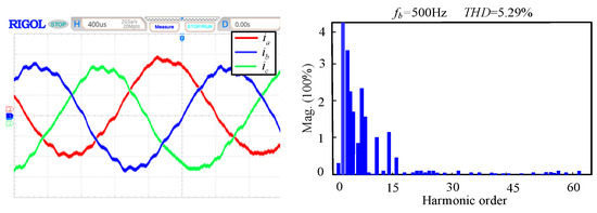 To verify the effectiveness and feasibility of the proposed scheme, the load current waveforms under different strategies are observed. In each group of experiments, the speed is set to 8000 rpm; the fundamental frequency is 666.7 Hz; and a load of 0.5 N/m is applied to HPMSM.