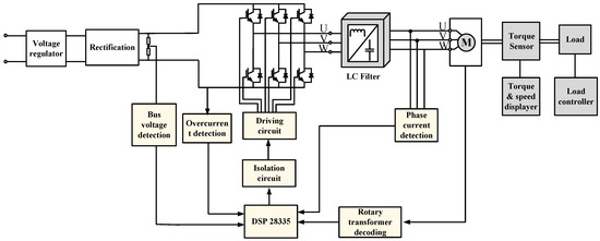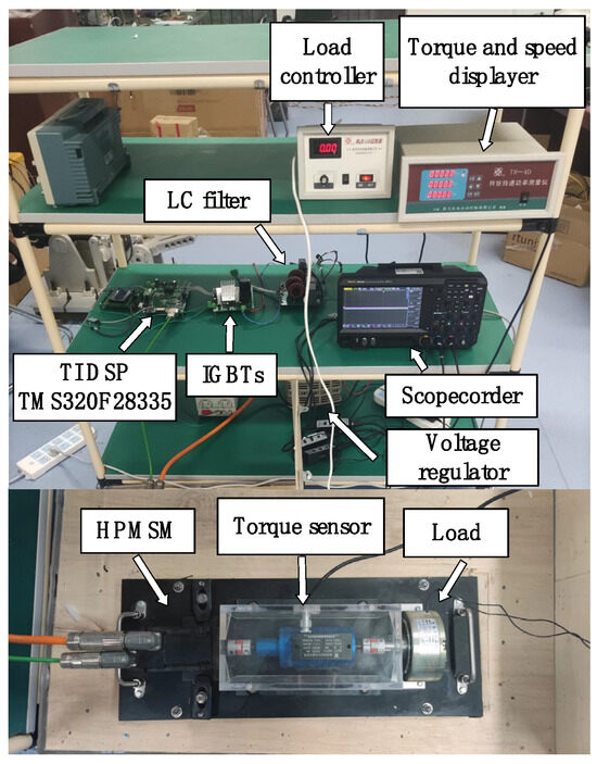 The experimental test setup is shown in Figure 16, and the LC filter is connected between the inverter and the HPMSM. The experiment is powered by a single-phase regulator with an output voltage of up to 250 V and a rated power of 3 kVA. The torque sensor is coaxially connected with the HPMSM, whose maximum measured torque is 1 N/m, and the measurement accuracy is 0.2%. The measured speed and torque are displayed in real-time on the torque and speed displayer. The hysteresis brake is used as the load; its rated torque is 2 N/m; and the load torque can be changed by the load controller. In order to demonstrate the experimental platform clearly, the schematic diagram of the system is given in Figure 17. Figure 17 shows the connection of the above measurement systems and, in addition, how the control system works. The sampled current and speed position information is processed by TMS320F28335, and the corresponding switching signal is generated in real-time to control the inverter bridge.