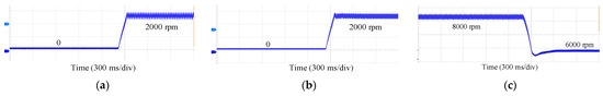 Comparing Figure 21a,b, it can be seen that without filtering high-frequency harmonics, the HPMSM shows a large speed fluctuation reaching the set speed of 2000 rpm, and the speed regulation performance is poor. But when the proposed harmonics suppression scheme is adopted, the speed fluctuation is significantly reduced, and the speed regulation performance is enhanced. Figure 21c supplements the result of the HPMSM with a sudden speed dropping from 8000 rpm to 6000 rpm. After the sudden speed change, HPMSM responds quickly with low overshoot and small steady-state error, which validates its excellent speed regulation performance.