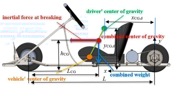 In Equation (2), L is the wheel base, md is the driver’s mass, and mv is the vehicle mass. The final COG position according to Figure 2 is Figure 2 and Figure 3 depict the inertial forces at acceleration, causing redistribution of ground reactions on a vehicle concept design.