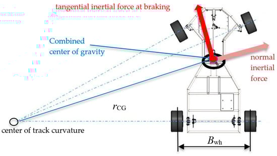 In Figure 2, the driver’s center of gravity is shown with a green circle, the vehicle’s center of gravity with orange, and the combined center of gravity (COG) with a red circle, with its height relative to the ground level marked by hCG, and the distance from the front wheels marked by LCG. The inertial force at braking in a straight trajectory is shown with the red arrow, and the combined weight with the blue arrow.