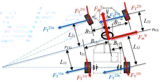 The sum of all friction forces on the tangential line is equal to the vehicle’s tangential inertial force, . For the following equilibrium equations, the presumption is the constant (or close to that) position of the vehicle’s chassis, or, in other words, a rigid-like behavior [35,36]. Setting the equilibrium moment of force equation around the tangential line, passing through the inner most wheel’s surface contact center, in Figure 4, denoted t11, yields