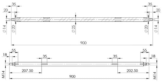 After calculating the diameters for the chosen sections in the worst-case scenario, by Equation (15), a final shaft geometry was chosen with respect to the available bearings, chain gears, the rod to manufacture it from, and technology, which is detailed with measures in Figure 6.
