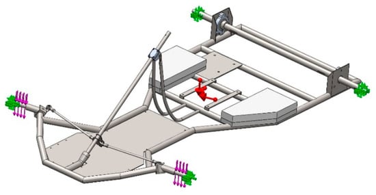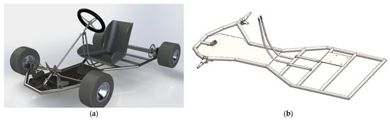 The chassis of a go-kart is mostly designed from circular thin-walled tubes welded into a frame, as presented in references [18,19,20,21,22,23]. The stability of the tube wall is the detail for which the most attention has been given in the mechanical integrity “domain” [24,25]. In an engineering sense, the “local” stability analysis of thin-walled structures is relatively difficult to conduct without the utilization of computer finite element analysis (FEA) programs [26,27,28]. The SolidWorks application was chosen for the modeling and analysis of displacement and stress in most cases. Every aspect of the vehicle was considered for optimization, so that the energy demand for a given race (drive) was minimal, as mentioned in references [29,30].