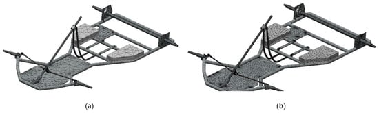 The normal reaction forces redistribution was calculated by a predictor–corrector method [30,37]. We showed a free body diagram for the vehicle dynamics, equations of equilibrium, and solutions for three COG kinematics cases that we considered the most intense cases for the wheel reaction force redistribution, i.e., driving conditions. A similar display in all of the details could be seen in reference [30]. Those forces are used as the loads in the chassis finite element model. The model consists of basic beam finite elements [27,28,39] for establishing the global stress distribution, and determining which joint is the most stressed one, so that it would be modeled with linear solid finite elements [27,28] for a more detailed analysis. Three different element characteristic measures, the length of the beam elements, and the edge length of solid elements, i.e., “mesh size”, were used to control the displacement and stress component convergence [27,28]. The analysis showed good convergence for both beam and solid element meshes. The results for the sub-model stability (buckling) analysis showed that the chosen tube wall thickness to diameter gives a safety factor value of five in most of the chassis. The lowest safety factor is around 1.6 in a small area around the front wheel axle tube joint. A large portion of the chassis was oversized (regarding the cross section). This leaves enough “space” for improvement upon the test ride and measurement and an increase in power if needed/desired.