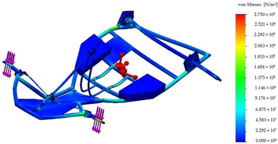 Based on the stress distribution, some improvement in the middle part of the chassis, the tubes passing along (under) the driver, have in the overall view, high stress. Our choice of the tube’s cross section is 25 mm of the outer diameter, a wall thickness of 2 mm, which is similar to a heavier go-kart, overall mass of 190 kg, the tube’s outer diameter of 25.4 mm (1”), but no wall thickness in [11], or 26/20 mm for 190 kg of mass in [15], up to the thickest wall tube of 3.125 mm in [21], so that part of the chassis could be made from a half-a-millimeter thicker wall tube, or a larger (by a few millimeters) diameter tube to lower the stress. Moreover, we would consider including an innovative addition to improve the strength and rigidity of the same tubes with either hydro-tubing, cold rolling (plastic deformation) of the circular tube to give it a “directional” rigidity, or some similar solution, with as little added mass and involved energy as possible.