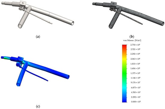 The most stressed part of the chassis is the steering area—the front wheel joint, as can be deduced from the previous analysis. Therefore, the steering part of the vehicle was further analyzed for local stability, as additional criteria for the chassis mechanical integrity. For this purpose, basic solid elements were chosen. They had the ability to describe the linear displacement field in each coordinate axis and the fields of the constant stress component [27]. The geometry of the steering part taken for a sub-model is shown in Figure 11a. An analysis of the stress components and equivalent stresses give the stress distributions, as shown in Figure 11b. The finest solid element mesh utilized for stability analysis is shown in Figure 11c. To compare the cross-sectional thickness of the tube wall, Figure 12 shows three different sizes of solid elements. After the displacement and stress analysis, the load at the sub-model boundary nodes were imported for the analysis of the sub-model stability.