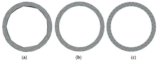 The size of the solid elements compared to the cross-sectional thickness of the tube wall: (a) coarsest mesh; (b) medium mesh; (c) finest mesh.
