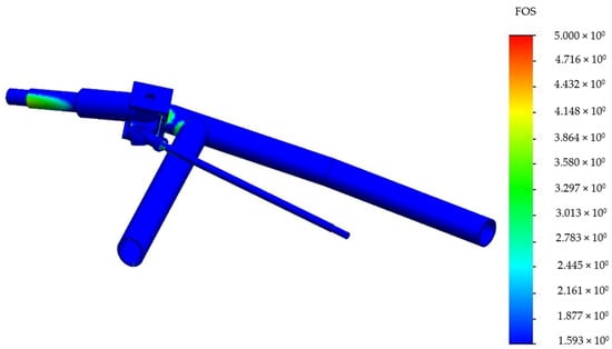 The stability analysis of the sub-model of the steering part, known as a “stub axle” for the finest mesh, is shown in Figure 13. The lowest value of the safety factor on the scale is 1.537, which is still satisfactory, as it should be noted that this stress is localized on a smaller part of the pipe wall (Figure 13) and is calculated from the most severe load case.
