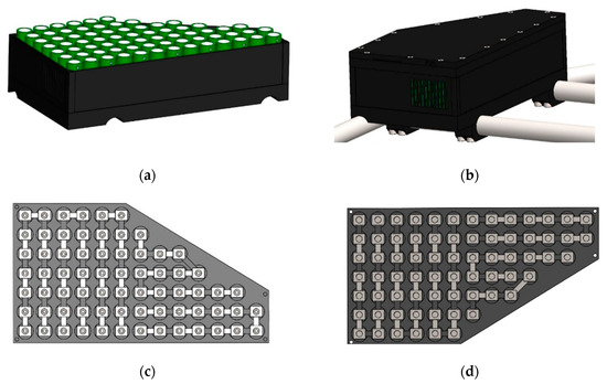 Battery system concept design: (a) cell placement in a holder box; (b) box with the cover attached to the chassis distribution as the basis for the sub-modeling view; (c) lower battery cell inter-connecting plate view; (d) upper battery cell inter-connecting plate view.