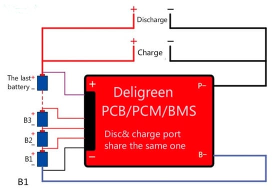 It is envisaged that each of the designed battery tanks in the presented conceptual design has its own BMS, and in the case of one empty series, the vehicle still runs on a different series. The selected BMS Deligreen is marked “14S 60A 48V”. The “14S” refers to the number of batteries in the series; “60A” is the maximum current at which the BMS switches off the system. Such a BMS is shown in Figure 16 [47]. The scheme of connecting the “14S 60A 48V” BMS assumes the connection to a maximum of 10 battery groups (B1 to B10) to the input connectors shown in Figure 16.
