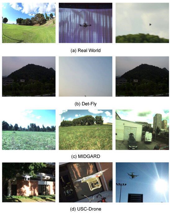 The main image-based UAV datasets are the Real World dataset [74], the Det-Fly dataset [75], the MIDGARD dataset [76], the USC-Drone dataset [77], and the DUT-Anti-UAV [78]. These 5 datasets contain 56,821, 13,271, 8775, 18,778, and 10,109 images, respectively, and their respective resolutions are 640 × 480, 3840 × 2160, 752 × 480, 1920 × 1080 pixels, and various resolutions. Their samples are shown in Figure 1. Compared to other UAV datasets, the Real World dataset stands out for its diversity in terms of UAV types and environments, despite the low-resolution quality of the images. This is because all the data in the Real World dataset are obtained from YouTube videos, whereas other datasets are typically collected by the researchers themselves. On the other hand, the Det-Fly dataset addresses the shortcomings of single-view UAV data by providing multi-view data that covers a wider range of angles and perspectives. The MIDGARD dataset and USC-Drone dataset also contain data from a single type of UAV and a richer environment, but they are limited by the disadvantage of having a single viewpoint. The DUT-Anti-UAV contains more than 35 types of UAVs with various background. The background in the dataset includes a wide variety of environments, such as the sky, black clouds, jungle, high-rise building, residential building, farmland, and playground. In addition, various lighting conditions (including dawn, day, dusk and night) as well as different weather conditions are taken into account. The datasets referenced, namely the Real World dataset, the Det-Fly dataset, the MIDGARD dataset, the USC-Drone dataset, and the DUT-Anti-UAV, can be accessed through the following provided links: https://github.com/Maciullo/DroneDetectionDataset, https://github.com/Jake-WU/Det-Fly, https://mrs.felk.cvut.cz/midgard, https://github.com/chelicynly/A-Deep-Learning-Approach-to-Drone-Monitoring and https://github.com/wangdongdut/DUT-Anti-UAV, accessed on 1 June 2023.