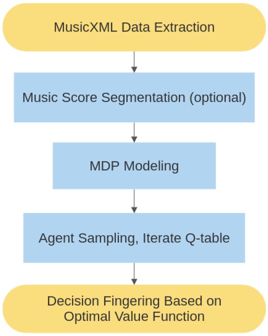 In this research, we employed rule-based approaches. We model the generation of piano fingerings as a Markov decision process (MDP). The agent interacts with its environment and evaluates the fingerings using a reward function. We introduce the prioritized sweeping algorithms [14] to implement model-based reinforcement learning. In order to execute the algorithm without enumerating the state space and action space of the piano fingering problem, we replaced the traditional Q-table used in tabular reinforcement learning with a hash table based on key-value storage. Additionally, we propose a method for segmenting the music score to enable the parallel execution of the algorithm. The completed processing steps are shown in Figure 1.