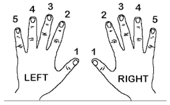 White key distance and hand feature matrix are illustrated in Figure 2. And, Figure 3 illustrates the correspondence between finger numbers and specific fingers.