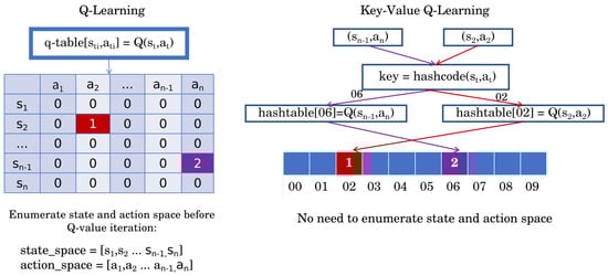 For this, we designed a key-value storage tabular reinforcement learning method, as shown in the Figure 5, replacing the underlying access of the Q-table with an arbitrary key-value storage system, such as a hash table. This method avoids the complete enumeration of the state space and action space. Like classical tabular reinforcement learning, this method is only applicable to MDPs with discrete state spaces and discrete action spaces, and requires that the state–action pairs in the MDP be finite. After the agent performs action a in state s, it will use a hash function to calculate the hash value of the state–action pair as the address of the hash table. This address stores the Q-value of the corresponding state–action pair . After performing the action and obtaining the reward r, the iterated new Q-value is written back to the corresponding address in the hash table, and then the agent enters the next state.