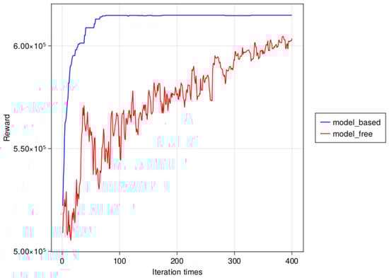The agent’s exploration strategy utilizes the epsilon-greedy algorithm with an exploration rate of . For the reinforcement learning algorithm in a fully deterministic environment, a learning rate of 0.99 is employed, emphasizing the learning of new Q-values to facilitate faster convergence. Since the constructed MDP for this task does not possess cyclic structures, the agent can reach the terminal state within a finite number of steps. Hence, a discount factor of is utilized, maximizing the prediction of absorbing future rewards, i.e., . In the planning process of the prioritized sweeping, a threshold of is chosen for the priority queue. Any state–action pair with a TD-error greater than is added to the priority queue. During the reinforcement learning algorithm’s iterations, the total reward is calculated based on the optimal value function every 10 iterations. If the change in total reward is within the range of , we consider that the algorithm has converged, and the iteration process is stopped.