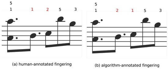 Comparison of human-annotated fingering and algorithm-annotated fingering. The numbers on the musical notes indicate fingering labels.