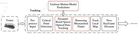 where, , , Z is the depth value of the key point in the camera coordinate system, and K is the intrinsic matrix of the camera. All the key points in the previous image can be predicted in the current image with Formula (3). Then, the reliable key point matching relationship between the adjacent images is established via a pyramid-based LK optical flow-tracking algorithm. Thus, the problem that the optical flow method easy to drop into local minima is improved, and the robustness and real-time performance of the algorithm are enhanced.