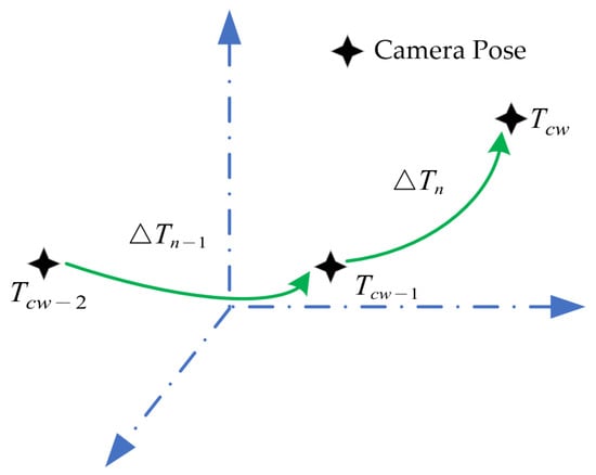 where is the relative pose variation of the camera between the nth image and the (n − 1)th image, and is the relative position variation of the camera between the (n − 1)th image and the (n − 2)th image. Given that and are known, the initial camera position of the current image can be predicted as follows: