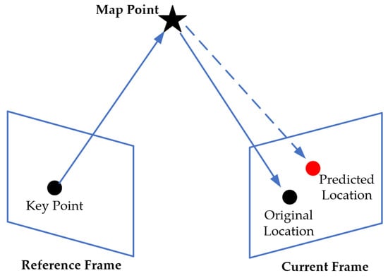 As shown in Figure 3, when the coordinate of a key point in the reference image (previous frame) and the corresponding map point of the key point in the world coordinate system are given, the camera position of the current frame can be predicted with Formula (2). Project the map point to the image coordinate system of the current frame via the camera model, and the predicted coordinate of the point in the current frame can be obtained as :