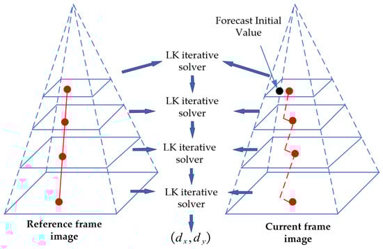 In this paper, the LK optical flow method is used to iteratively solve the motion vectors of key points in the pyramid image. As shown in Figure 4, when calculating the optical flow, it is started from the topmost image of the pyramid, and the predicted value of the key point in the current frame is obtained by the uniform motion model, which is used as the initial value of the top-level iteration to calculate the motion vector of the top-level. Then, the tracking result of the previous layer is used as the iterative initial value of the optical flow of the next layer and the motion vector of the layer is calculated. The process is repeated between the adjacent layers of the pyramid until the lowest layer of the pyramid (the original image) is reached, to obtain the final motion vector and achieve the key point matching between the adjacent images. To evaluate the tracking accuracy of key points and reduce the number of iterations of the optical flow solution, a judging criterion for stopping the iteration of the algorithm is set in this paper, based on the average residual of pixels in the neighborhood window of key points. The average grayscale difference of pixels in the neighborhood window of the corresponding key points between the adjacent images can be expressed via the following equation: