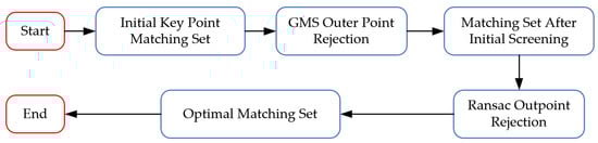 By combining the uniform motion model and the pyramid-based LK optical flow method, a robust initial key point matching set can be established between two adjacent images. However, mismatches may still occur. To solve this problem, a combined mismatch point (outer point) elimination algorithm is adopted in this paper to filter out the outer points. The specific process is shown in Figure 5. The main idea is to combine different outlier rejection algorithms to eliminate outer points in turn. This can effectively combine the advantages of different algorithms to improve the speed and accuracy of outlier rejection.