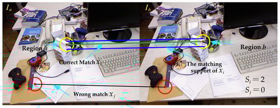 The core idea of the GMS algorithm is that the correct key point matching should satisfy the motion smoothness constraint, which means there are more matching pairs in the neighborhood of the correct matching point for support, while the wrong matching point does not have this property. As shown in Figure 6, suppose there are key points in two adjacent images and the initial key point matching set is , where represents the matching pair i, and the neighborhood of this matching pair is defined as . The neighborhood of the correct matching point is in the yellow circle, and the neighborhood of the false matching point is in the red circle. The support quantity of the matching pair in the neighborhood of the correct matching is , while the support quantity of the matching pair in the neighborhood of the incorrect matching is . Outliers can be identified and filtered out by the support of matching pairs in the neighborhood.