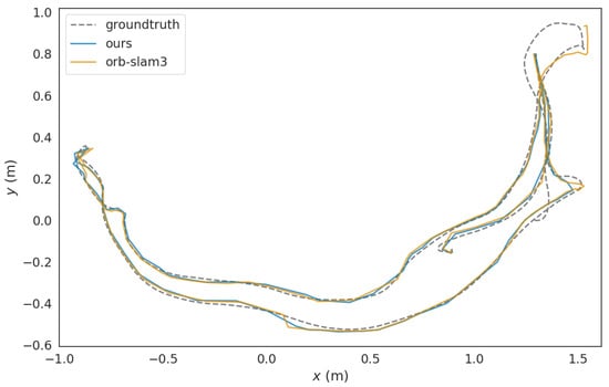 Figure 7 shows the comparison projected onto the x-o-y plane between the ground truth and the trajectories generated by the proposed system and the ORB-SLAM3 system under the fr1-desk2 sequence. The dashed line represents the ground truth of the dataset, while the blue and orange curves represent the trajectories of the proposed system and the ORB-SLAM3 system. Both systems passed the test under this sequence, indicating that both systems have good robustness. However, the trajectory of the system proposed in this paper is closer to the ground truth in some local areas.
