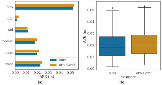 Figure 8 shows the APE comparison between the two systems under the fr1-desk2 sequence. The histogram compares the error parameters of the APE in the two systems, and the box diagram shows the fluctuation of the data. The histogram analysis shows that the supposed system in this paper outperforms the ORB-SLAM3 system in five of the APE error parameters, including the RMSE, minimum error (Min), median error (Median), mean error (Mean), and maximum error (Max). However, it is slightly inferior to the ORB-SLAM3 system in the standard error (Std), but the difference is relatively small. According to the box plot analysis, the data fluctuation of the proposed system is slightly smaller than that of the ORB-SLAM3 system. It shows that the positioning accuracies of the two systems are better under this sequence, and the differences among the various parameters in APE are small. However, on the whole, the positioning accuracy and stability of the proposed system in this paper are slightly better than that of ORB-SLAM3, and RMSE for translation is 0.021, which meets the requirements of positioning and map construction.