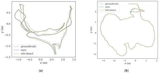 Figure 13 shows the comparison projected onto the two-dimensional plane between the ground truth and the trajectories generated by the proposed system and the ORB-SLAM3 system under the other sequences. Among them, it can be seen that the VO in this paper is closer to the ground truth in the local trajectory from the (a) sequence, and the (b, d, e) sequence shows that both algorithms are close to the ground truth. Due to the dynamic objects present in the (c) sequence, both two algorithms produce a drift when they estimate the camera pose in the part of the image stream where dynamic objects are present, which shows a lack of ability to deal with dynamic objects.