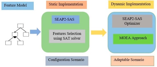 Regarding the first challenge, as mentioned above, the conversion of the SAS design into the context of the search algorithm was performed manually [2,9,10], which makes the process costly. Furthermore, feature dependencies are frequently disregarded, wasting important function evaluation time on incorrect solutions during SAS runtime with little assurance of finding accurate solutions. In order to improve SAS during runtime, researchers [11,12] have linked the feature model [13] with search techniques. while taking category relationships into account. The use of search techniques to solve issues with the software product line would be the inspiration for this study [14]. The method frequently uses a straightforward binary format to encode all the features. This could result from the diverse dimensions and add needless complexity to the SAS at a dynamic level. For the second problem, SAS runtime efficiency has been achieved by utilizing exact search [11,15] and objectives aggregation as a weighted sum methodology. Modern SAS, however, frequently demonstrates considerable variability, expanding the search space of all potential solutions and making the issue unmanageable. From this point on, the precise search may runtime fail to scale. Search-based software engineering (SBSE) typically uses stochastic search, especially when combined with evolutionary algorithms, on the other hand, tends to be inherently reliable when it comes to tackling issues with extremely huge numbers of different solutions [16].