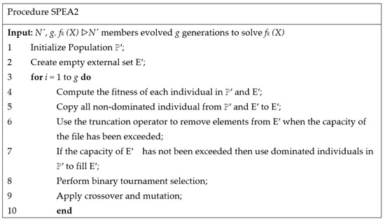 Figure 2 explains the pseudocode of the SPEA2 algorithm, where fitness criteria for each individual are described in the population.